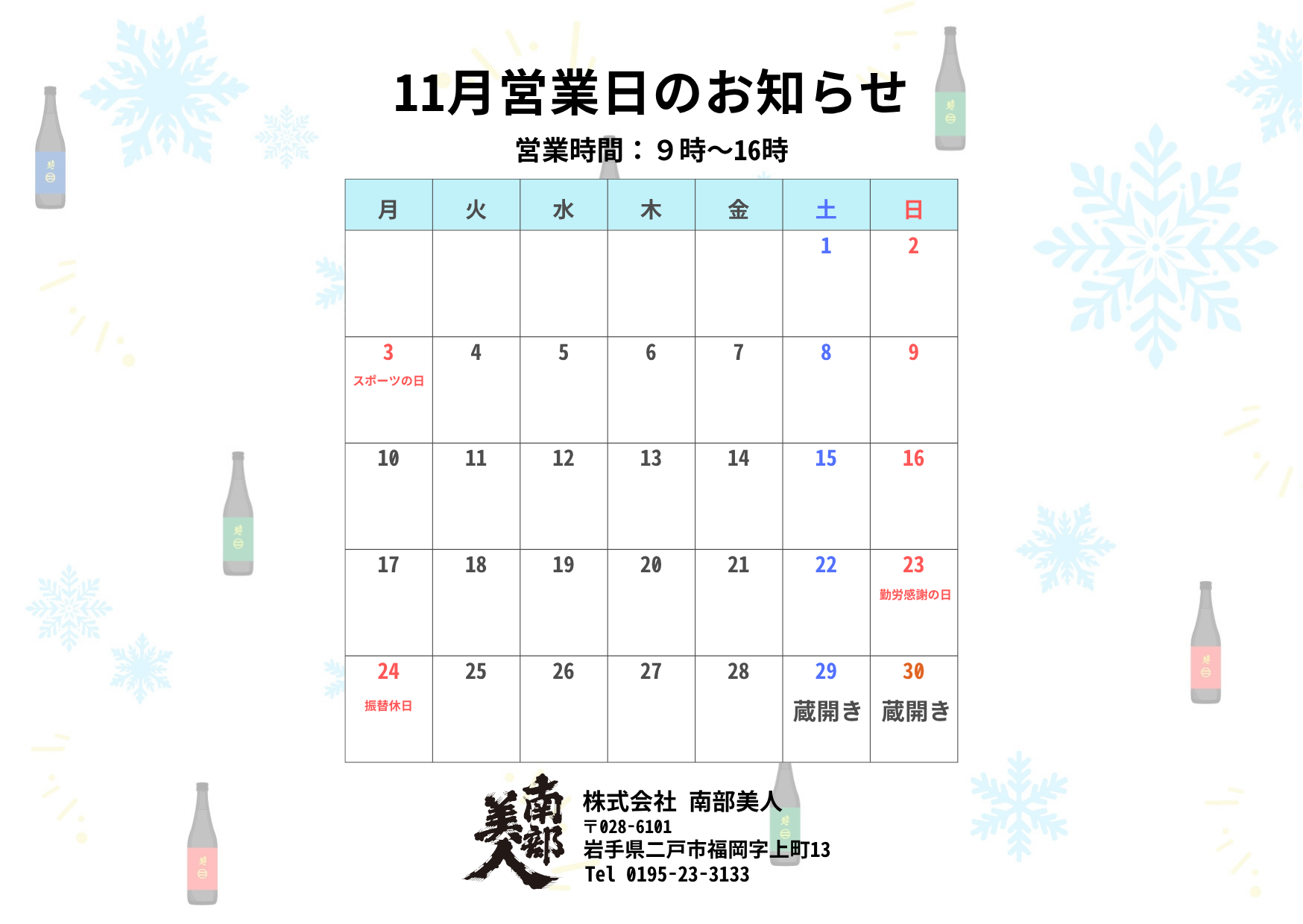 都度内容は変わりますが、二戸近隣の食材を用いたおつまみの提供や酒粕の詰め放題なども行っております。